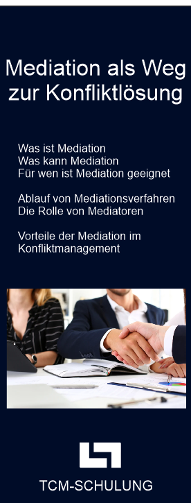 Mediation (lat. Vermittlung) ist ein nicht öffentliches Verfahren konstruktiver Entscheidungsfindung und Konfliktregelung, bei dem die beteiligten Parteien (z.B. eines Rechtsstreits) mit Unterstützung eines Dritten, des Mediators, einvernehmliche Lösungen suchen, die ihren Bedürfnissen und Interessen dienen. Ziel der Mediation ist eine verbindliche, in die Zukunft weisende Vereinbarung (Konsens). Die Leitung und Moderation der Mediation (insb. Themensammlung, Klärungshilfe und Verhandlungen) wird einer besonders geschulten, unabhängigen und unparteiischen Vermittlungsperson („Mediator“) übertragen. Mediatoren unterstützen die Parteien dabei, die strittigen Themen und Streitpunkte zu identifizieren und eigenverantworlich Lösungsoptionen zu erarbeiten. Sie entscheiden aber nicht in der Sache, nicht „für“ oder „über“ die Parteien. Unbearbeitete Konflikte (insb. in Unternehmen, am Arbeitsplatz, zwischen Geschäftspartnern, … ) binden Ressourcen, sie kosten viel Kraft, Nerven und letztlich viel Geld. Auch der Streit vor Gericht ist teuer und bringt selten den gewünschten Erfolg. Deshalb gewinnt Mediation als Alternative auch in Deutschland zunehmend an Bedeutung. |